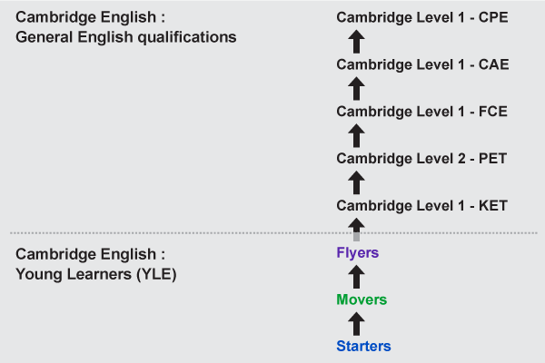 As shown on the flow chart above, students first finish the YLE tests (Starters>Movers>Flyers) and then proceed to take the tests for General English qualifications (KET> PET>FCE> CAE>CPE) step by step.